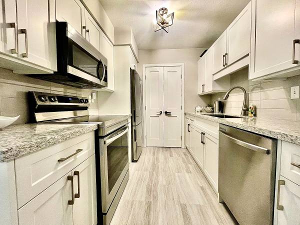 Extra spacious and bright, fully furnished 1-bedroom and 1.5-bathroom townhome located in the Valhalla complex across from the Marketplace. The bedroom has a queen bed and ensuite bathroom. There is also a half bathroom in the unit. Both bathrooms and kitchen were recently renovated including stainless steel appliances in the kitchen. There is a large laundry room with a washer/dryer and room for gear. There is a small corner office in the living room area with a desk and office chair so you can work from home. The unit also comes equipped with a gas fireplace (gas is covered by strata), TV and private ground level patio. The complex offers a common hot tub, caged bike storage and one underground parking spot (max 1 car).